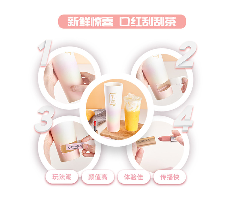 1、不知二口红刮刮茶,以口红作为媒介,模式新、颜值高、口味好,玩法新奇,迅速攻占女性消费群体;