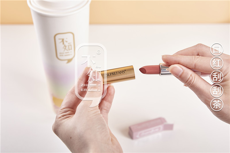 不知二口红刮刮茶是万旭餐饮2019年重点打造的茶饮品牌。借势口红经济,撕杯有惊喜,茶饮玩出色,运用口红作为媒介,不仅建立自身产品壁垒,也增加消费者的产品互动体验感,吸引亿万粉丝前来门店消费购买以及慕名打卡,并在互联网社交平台形成二次传播,作为不知二的镇店之宝,这款整整高出普通杯子一个身段的口红杯一出场就赚足了眼球,拿着逛gai回头率高达90%。